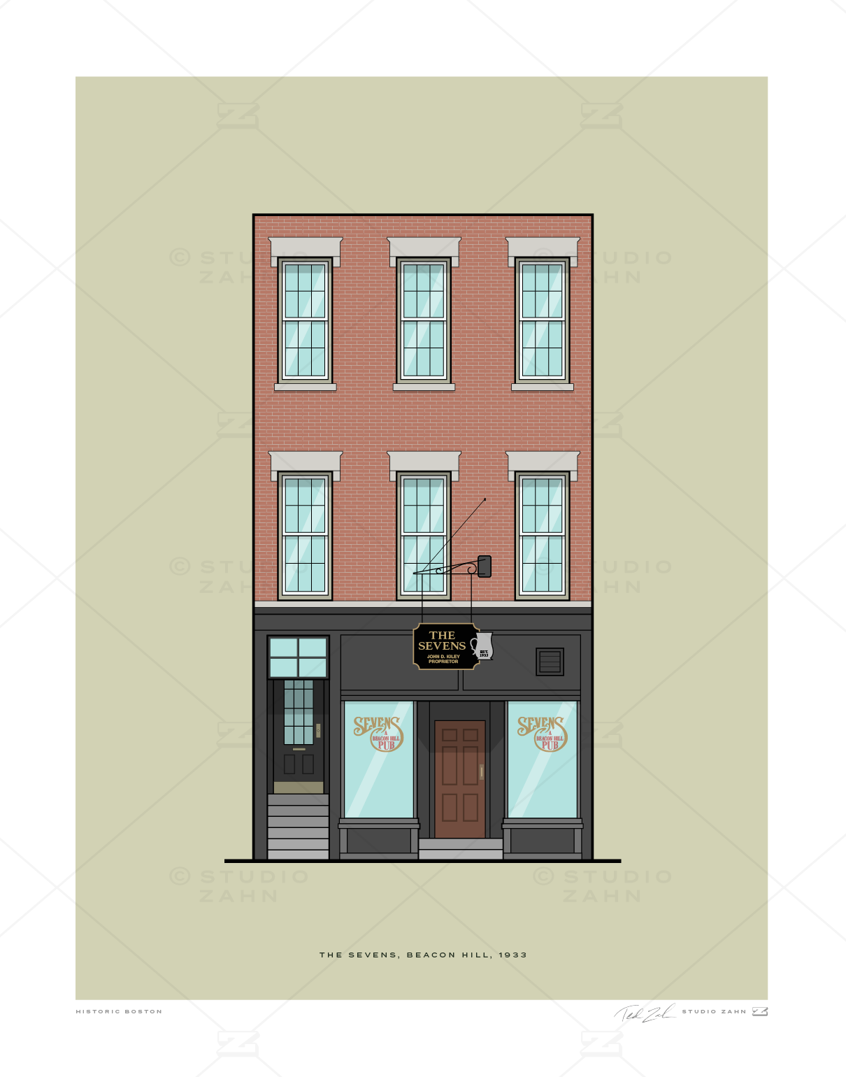 Art print of the iconic Sevens Ale House, the Beacon Hill institution on Charles Street since 1933.