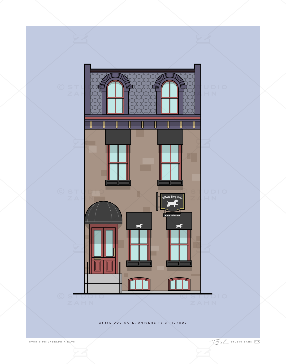 Art print of the White Dog Cafe, beloved University City hangout since 1983 and one of the city's pioneers in sustainable, farm-to-table dining.