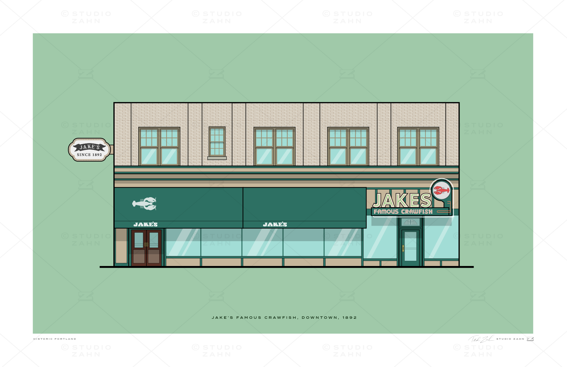 Art print of the legendary seafood eatery Jake's, one of Portland oldest businesses, opened by Jacob (Jake) Lewis Freiman in 1892 at the corner of Stark and 12th. It's hosted tens of thousands of locals along with celebrities ranging from Humphrey Bogart to Michael Jordan.