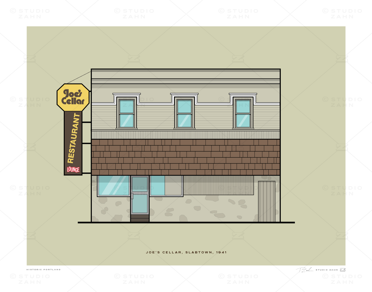Art print of Joe's Cellar, longtime Slabtown dive and greasy spoon dating way back to 1941.