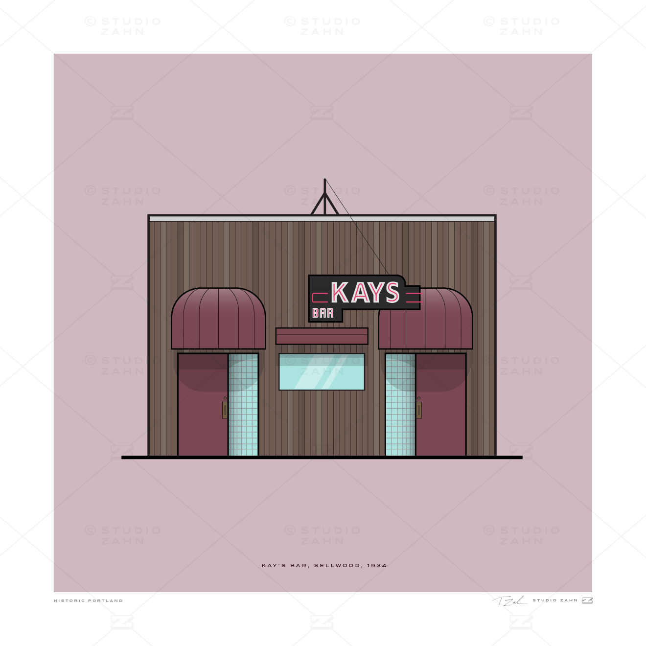 Art print of Kay's Bar, the classic Sellwood neighborhood haunt anchoring the corner of Milwaukie and Bybee since 1934.