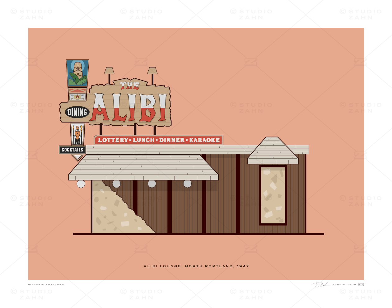 Art print of the Alibi Lounge, the historic PDX dive (and karaoke showcase) that opened in 1947, part of the Tiki trend that swept American after WWII.