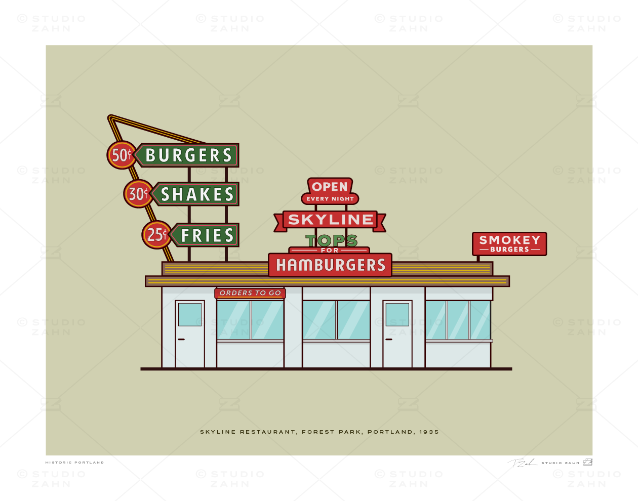Art print of the original facade and neon of Skyline Restaurant, the classic Forest Park burger joint opened in 1935 and still going strong.