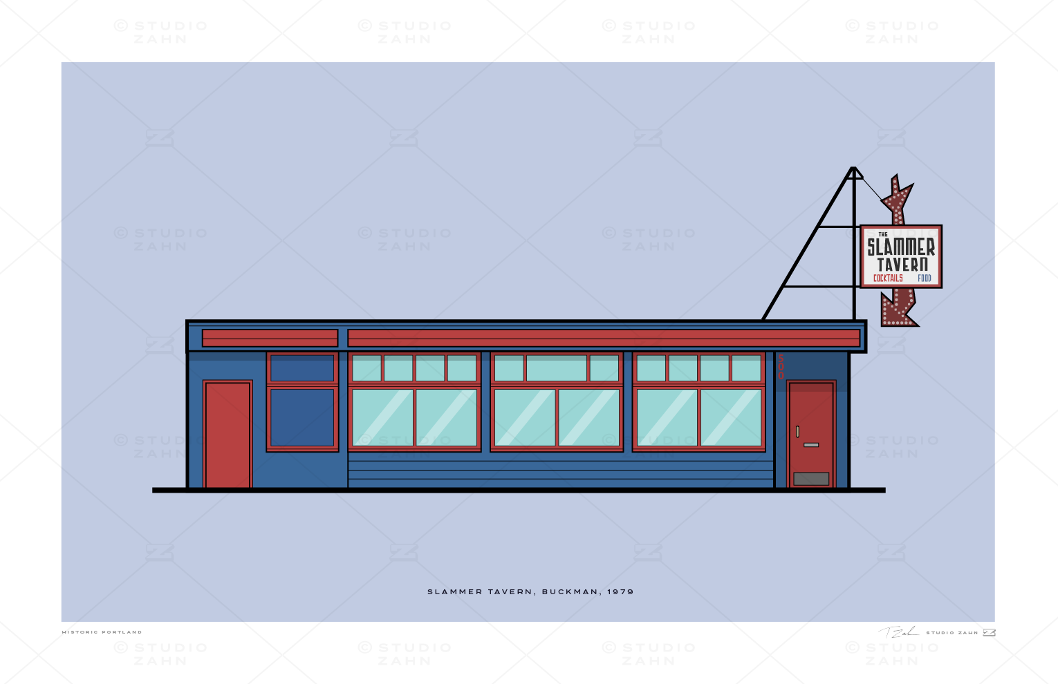 Art print of the "friendliest bar in Portland," the Slammer Tavern, the iconic dive at the corner of Stark and Sandy ... family-owned since 1979.