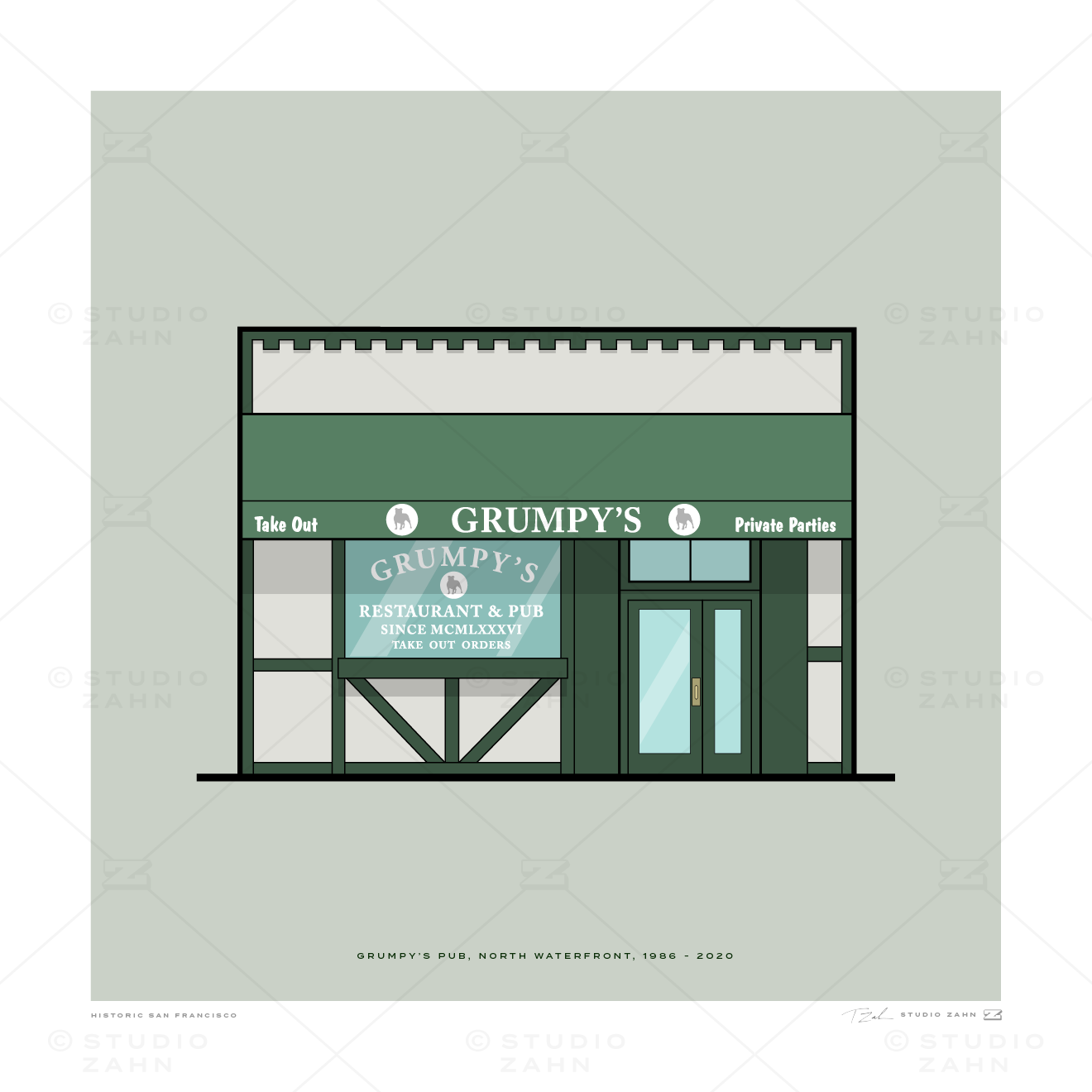 Art print of Grumpy's, the restaurant and bar (and unofficial after-hours headquarters for SF's advertising world) from 1986 to 2020.