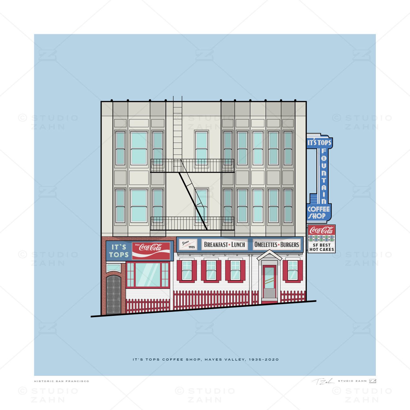 Art print of the Market Street legend It's Tops, the iconic Hayes Valley coffee shop and greasy spoon for more than 85 years — run by the Chapman Family for the last 68 — before closing for good in the midst of COVID in 2020.