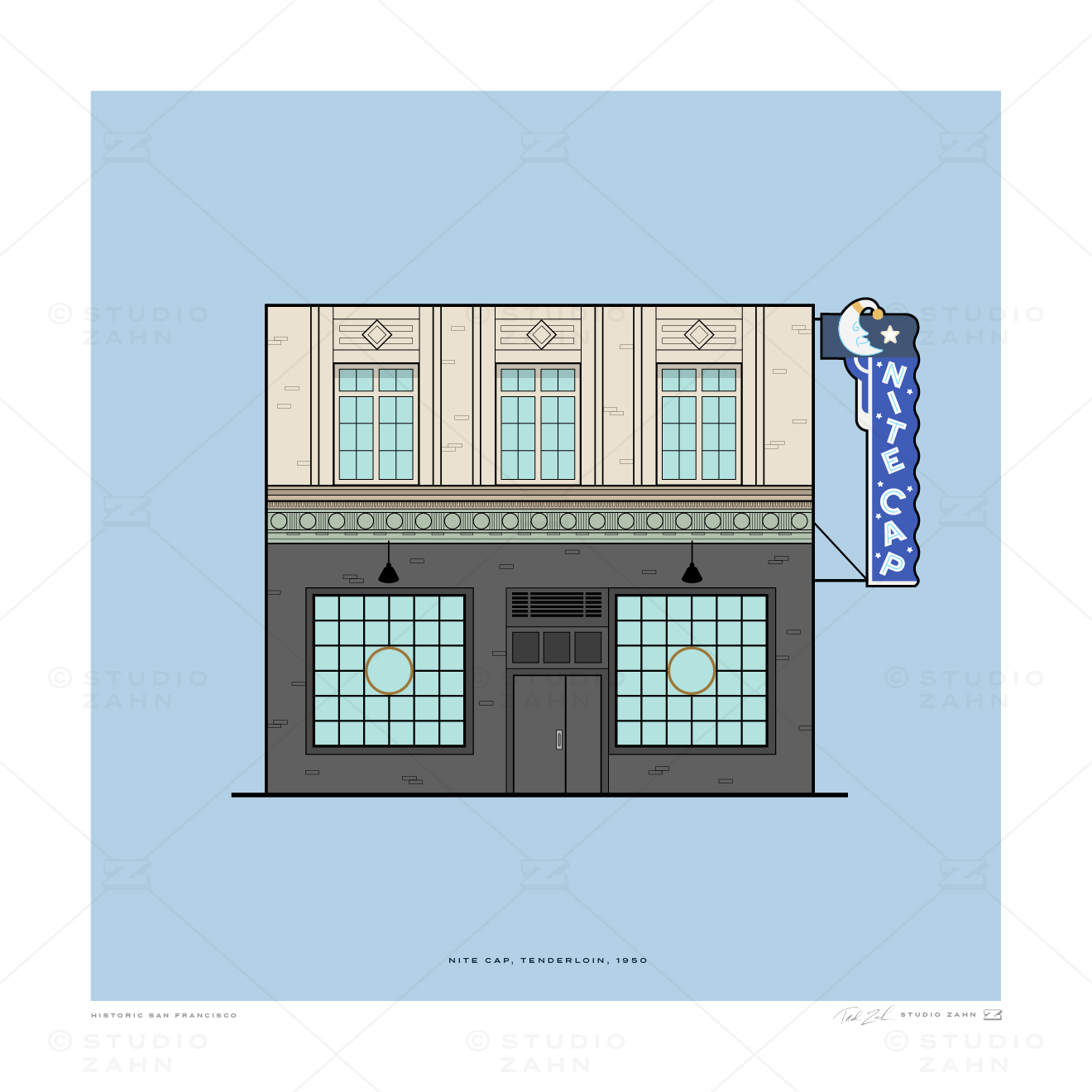 Art print of the Nite Cap, the legendary Tenderloin dive with the can't miss neon sign, dating to 1950.