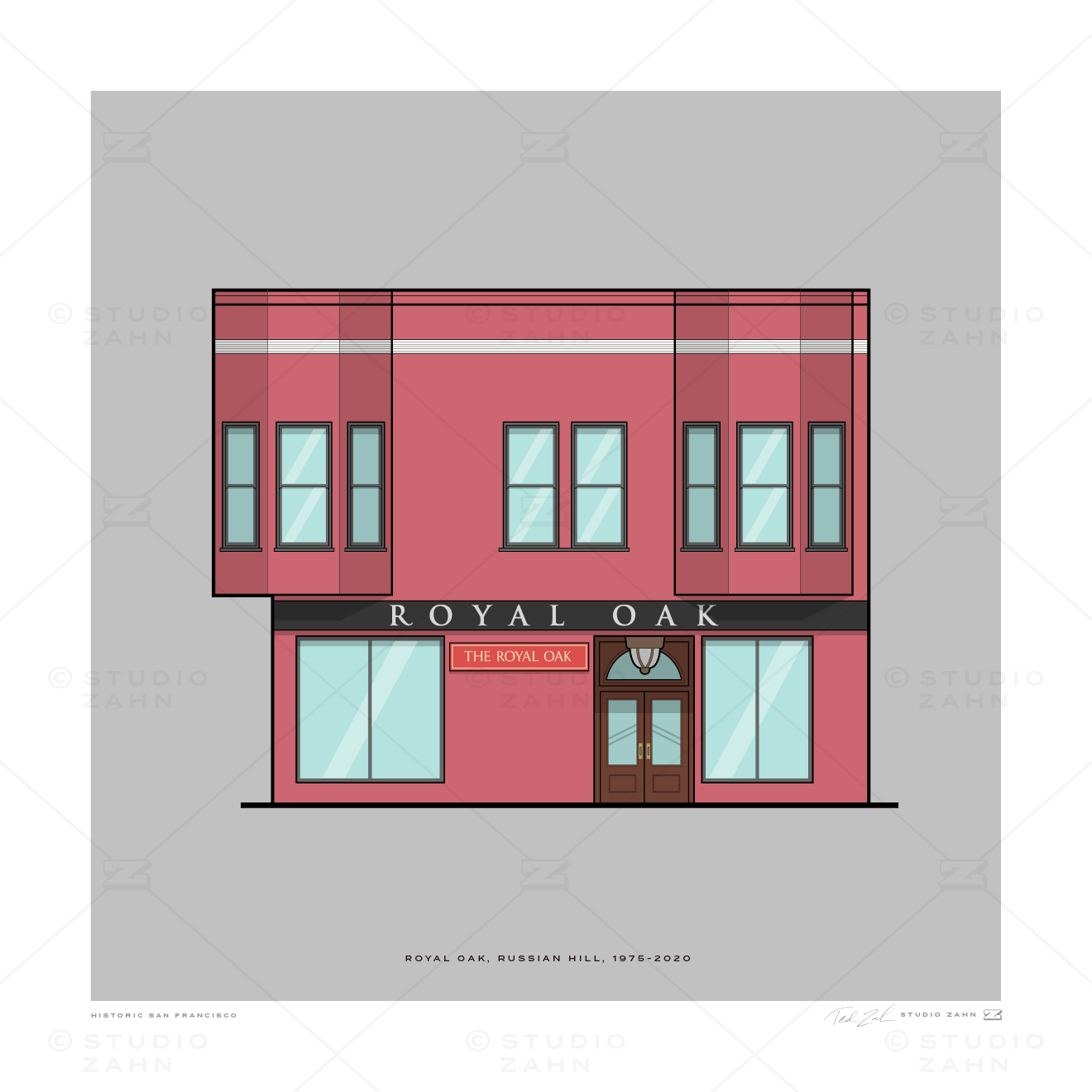 Art print of the Royal Oak, one of San Francisco's earliest — and last — fern bars, and a Russian Hill neighborhood mainstay for 45 until we lost it to the pandemic.