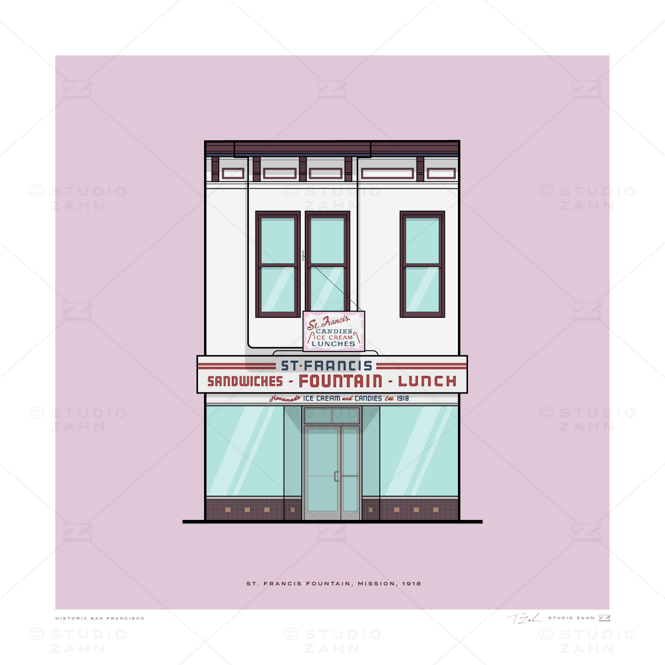 Art print of the iconic St. Francis, serving up ice cream, candies and diner classics from this beautiful storefront on 24th and York since 1918.