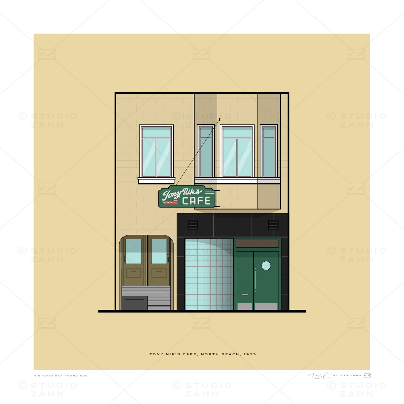 Art print of Tony Nik's Cafe, the cozy little time capsule in the heart of North Beach, one of the first bars to open in the neighborhood after the repeal of prohibition and going strong ever since.