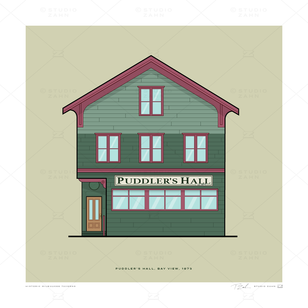 Art print of the Bay View institution Puddler's Hall. “Puddlers” refers to the craftsmen who toiled in the furnaces of Milwaukee Iron Company. Puddler’s Hall was built in the 19th century as a union meeting hall, eventually reinventing itself as a tavern and hub for the neighborhood.