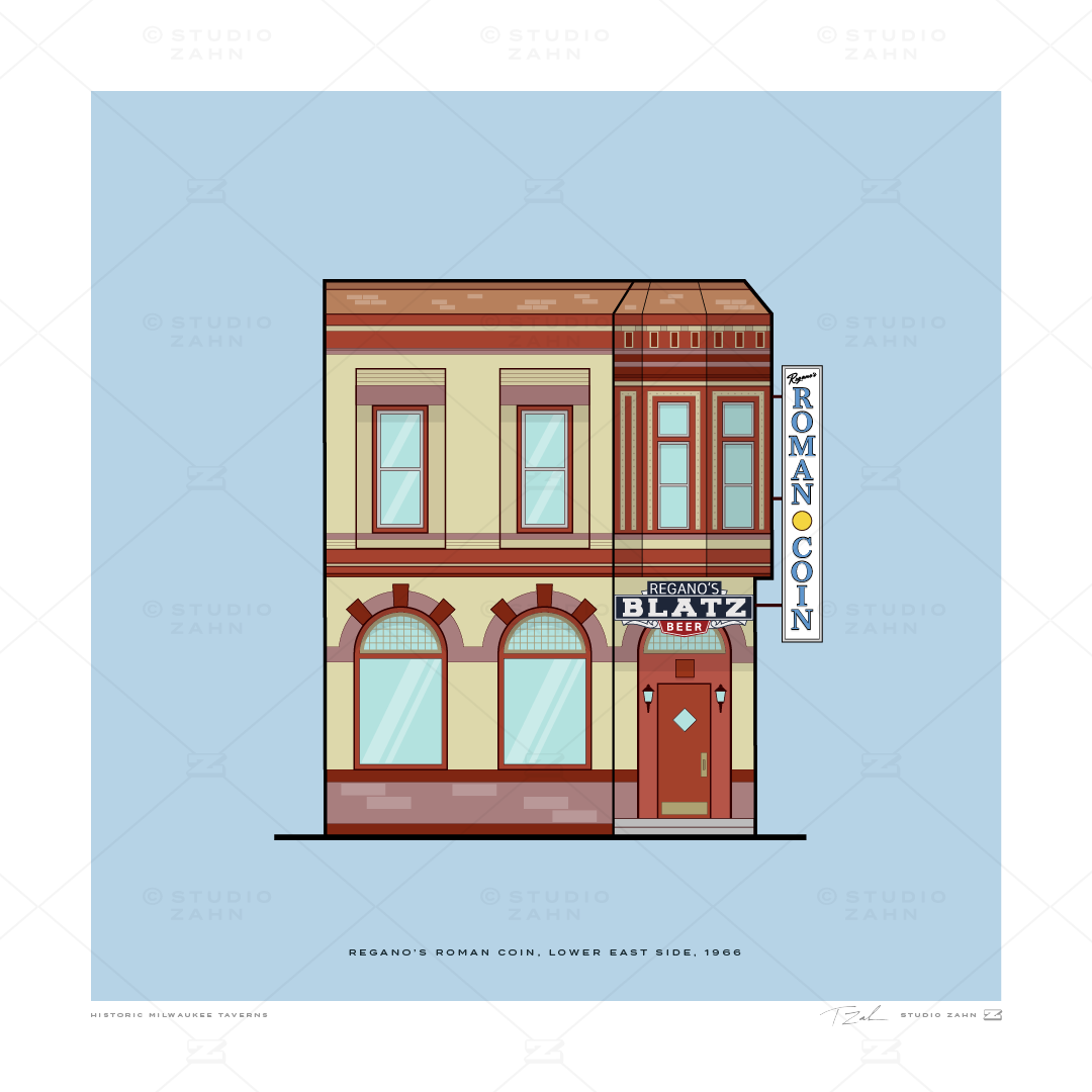 Art print of Regano’s Roman Coin, the Brady Street icon run by the Regano family since 1966. The ornate building itself dates to the 1890s, when it opened as the Pabst Saloon.