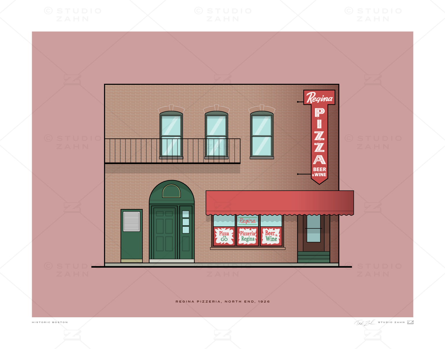 Art print of Regina Pizzeria, Boston's oldest pizzeria, founded by Italian immigrant Luigi D'Auria ... still lining up fans around the block 100 years later.